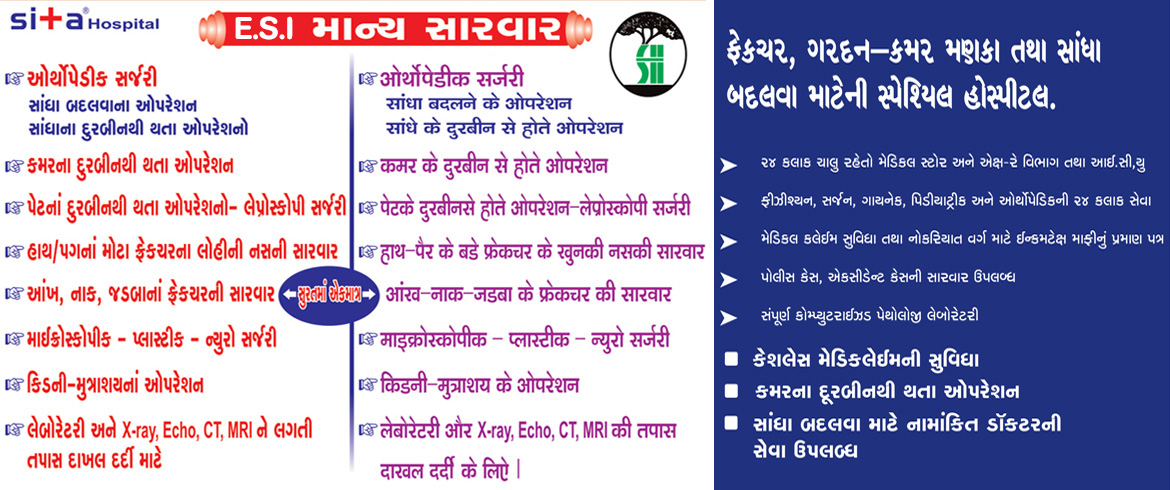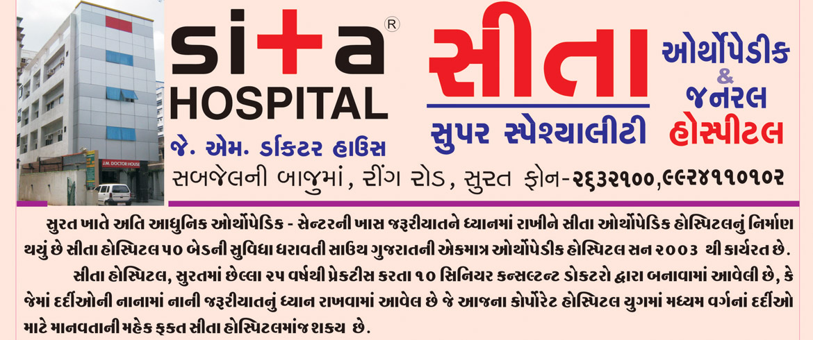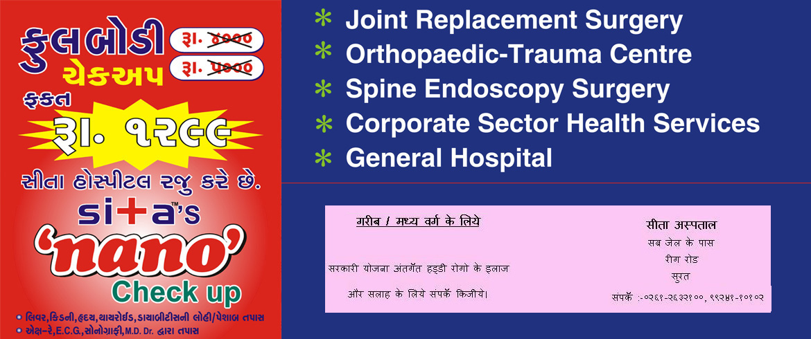 Sita Hospital is a mainly Orthopedic based hospital & also multi-specialty hospital in Surat, Gujarat. It was started on 12th October, 2003 by Dr. J. M. Patel (SR. Gynecologist), Dr. A. K. Jogia (SR. Orthopedic Surgeon), Dr. Jignesh Patel (Orthopedic) & Dr. Amita Patel (Pathologist). It is a 50 beded hospital situated in the prime area in Surat.